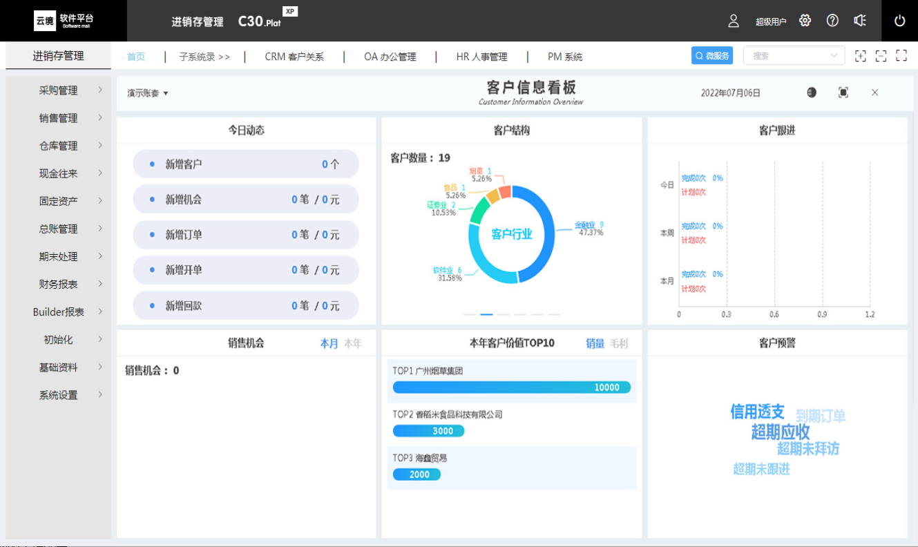 云境-C30.Plat XP 进销存财务管理系统软件是:一套完整的企业业务管理系统。系统高效的实现了进货管理,销售管理,仓储管理,财务管理 ...等,并科学地融入Builder-II二次研发工具,有着极好易用性和实用性。软件平台支持多个子系统模块插件并行应用,实现子系统与主系统数据共享、数据穿透、业务关联。扩张了企业管理的应用,有着极好的易用性和实用性,全面提升了企业的管理能力。优越的技术架构支持系统云应用、桌面应用、APP 应用。